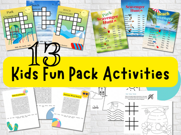 Fun for all ages activities pack including scavenger hunt, coloring pages, word search, tic tac toe, word scramble; scavenger hunt.